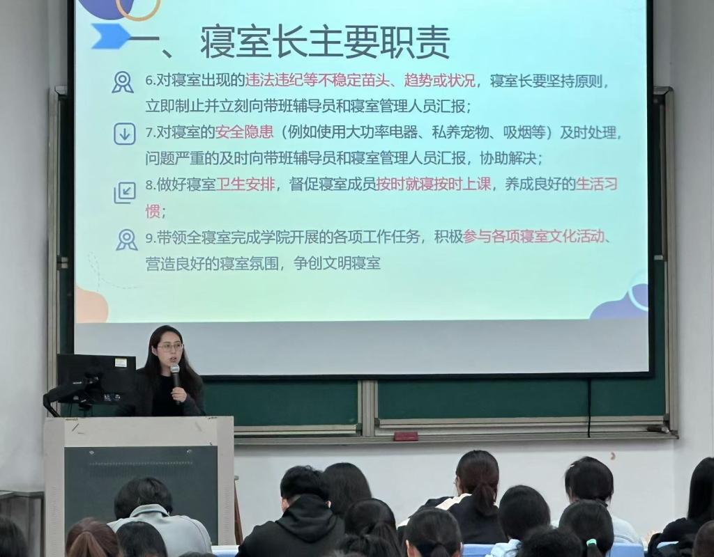 会议伊始,孔蕾老师围绕寝室管理细则展开讲解。她重点介绍了寝室长的主要职责及其奖惩制度,确保全体寝室长能够清楚了解并有效执行。孔老师强调了寝室长在安全监督、氛围营造、矛盾调解中的核心职责,对全体寝室长提出了殷切希望,呼吁寝室长发挥带头作用,带领寝室成员共同营造一个和谐、温馨、向上的寝室氛围。