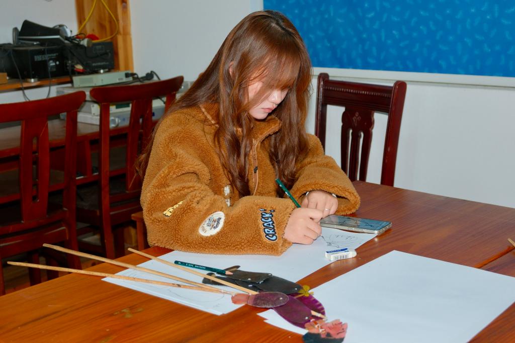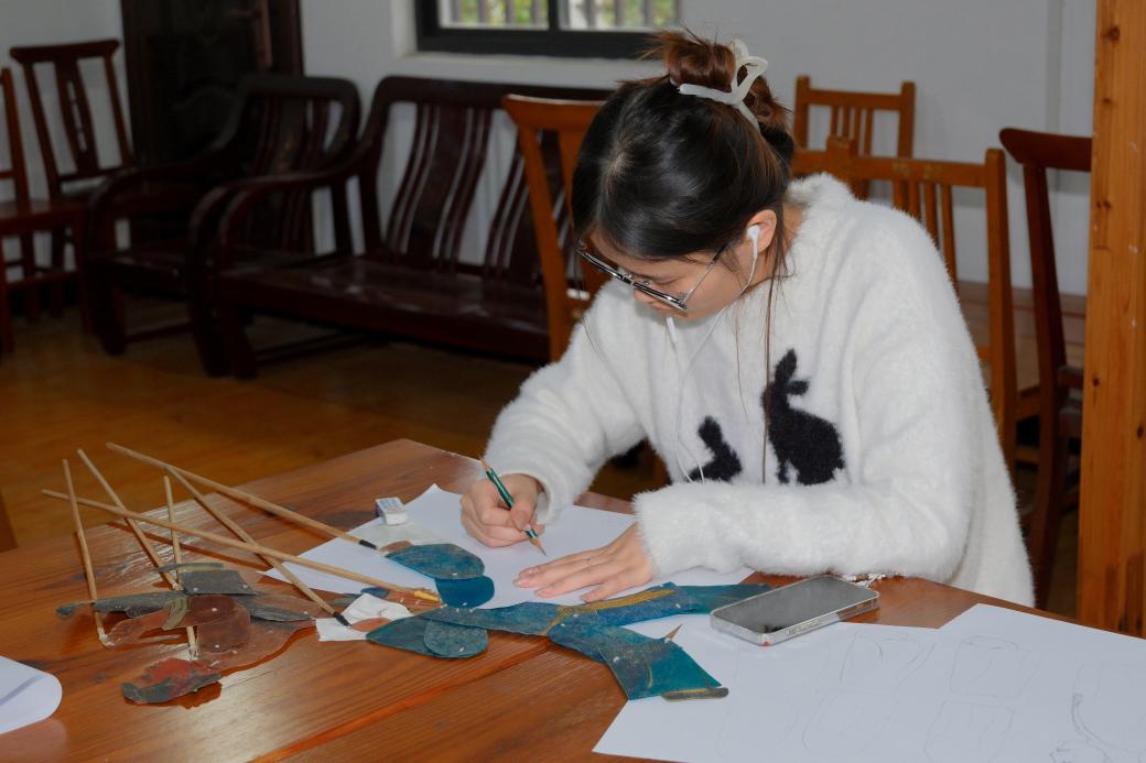 设计定稿后,便进入了皮影制作的关键工序——落稿于牛皮。同学们将半透明的干牛皮小心翼翼地覆盖在精心设计的画稿上,借助灯光映照,以画笔一丝不苟地勾勒出图形轮廓。相较于纸面作画,坚韧的牛皮对运笔的耐心与稳定性提出了更高要求。每一笔精准勾勒,都是对匠人精神的初次体悟,更是对心性的打磨与沉淀。从纸稿到牛皮的跨越,让创意构想真正落地为可触摸的实体,也让同学们深刻感受到校地共建“互助共赢”的实践意义——陆泽村提供的非遗皮影传承资源,与高校学子的文化创意能力形成有效互补,正是共建协议中“资源共享、优势互补”理念的鲜活实践。