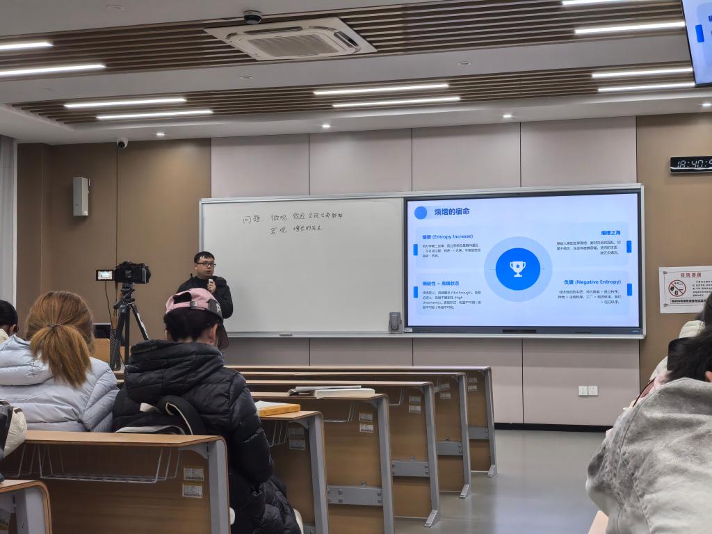 李承翰老师为基础课程赛道的《经济学原理》带来了跨学科的新颖视角。他大胆融合信息论、计算主义等前沿思想,将经济增长理论诠释为一个社会系统对抗熵增的“类学习”过程,并以此为框架,引导学生从信息处理与制度学习的维度,深入探讨中国经济增长的内在逻辑,极大地激发了学生的理论兴趣与批判性思考能力。