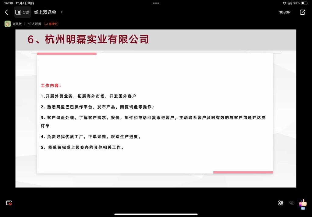 本次宣讲会集结了跨境电商领域数家优质企业,业务涵盖家居用品、轻工制造、电子商贸、外贸综合服务等多个细分赛道,既有深耕行业多年的资深企业,也有极具发展潜力的新锐企业。企业集中释放外贸业务、平台运营、客户开发、供应链管理、跨境营销等多类岗位,岗位需求与学院专业设置高度契合,为学子提供了丰富多元的就业选择。