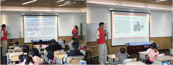 活动现场,志愿者们将严肃的军旅知识转化为孩子们易懂的视觉体验。在观礼环节中,通过播放阅兵仪式的震撼画面,展示军人整齐划一的队列、昂扬的精神风貌,帮助孩子们了解军队的纪律性与凝聚力,明白“坚毅”与“团结”的意义。在红色故事环节,志愿者们用生动的讲述,把红军战士雪中送衣的往事带到孩子们跟前。当孩子们听着红军经历磨难却又不折服的长征故事,他们的眼神里多了几分柔软的敬意,把“军人爱人民”的温暖悄悄记在了心里。