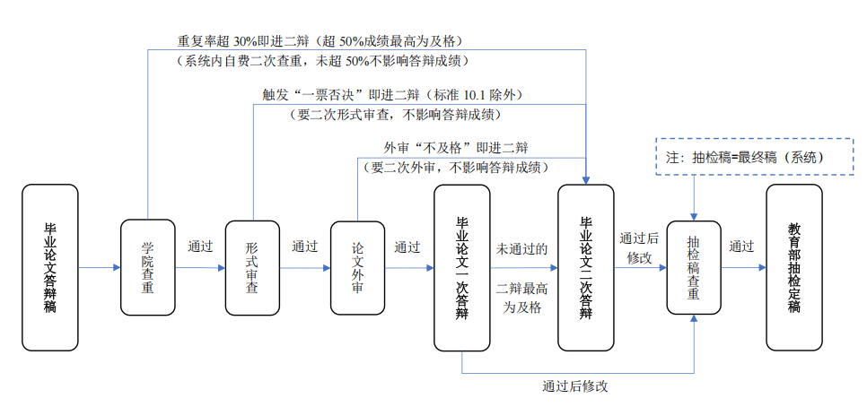 1.学院统一查重:重复率超30%即进入二辩;超50%答辩成绩最高为及格。查重结果超30%学生修改后自费系统查重,低于30%方可进入二辩。