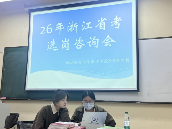 活动现场,社会导师结合浙江省考最新招录政策,针对金融类岗位的招录条件、竞争态势、职业发展路径等关键问题进行深度解析,助力学生精准匹配自身优势与岗位需求。同时,老师还围绕备考规划、科目复习重点、报考流程等高频问题提供1对1答疑,帮助学生破解选岗困惑,制定科学高效的备考方案。
